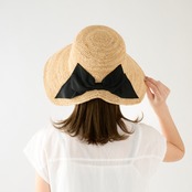 強い日差しからしっかりと顔を守るつば広タイプながら、後ろのつばが割れているセパレートデザインなので、首元に風が通りやすく、ローポニーテールでも髪の結び目が邪魔にならずかぶりやすいデザインです。 セパレート部分に沿うように付けられた大きなリボンはデザインのアクセントに。