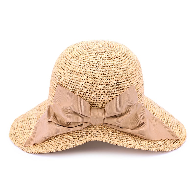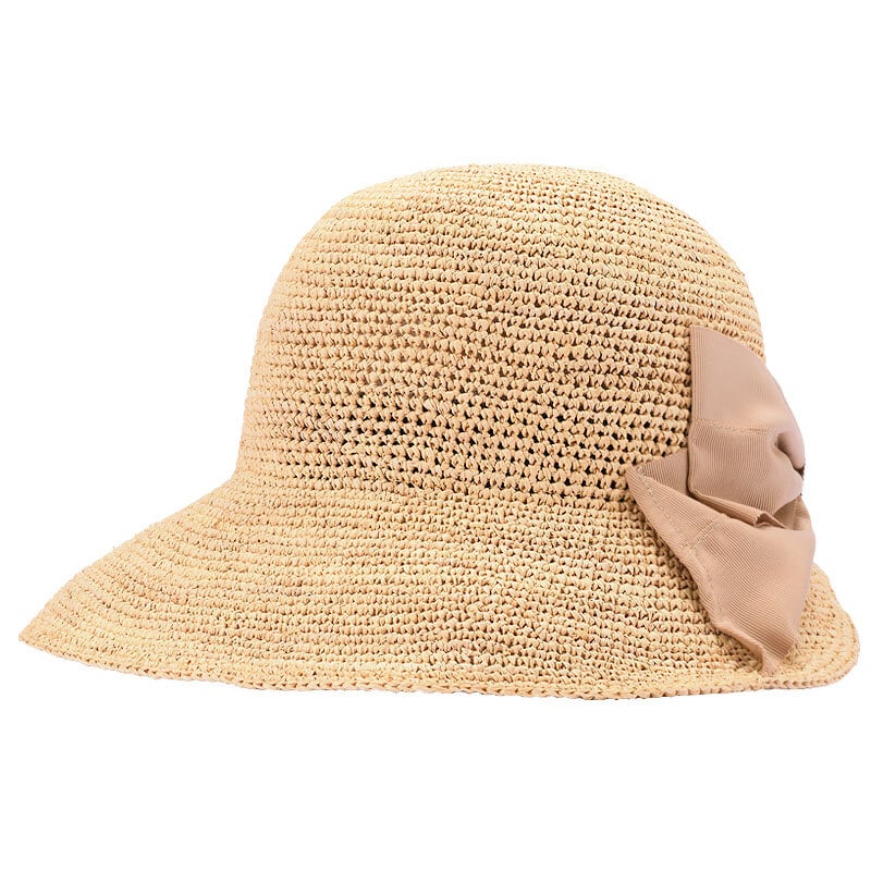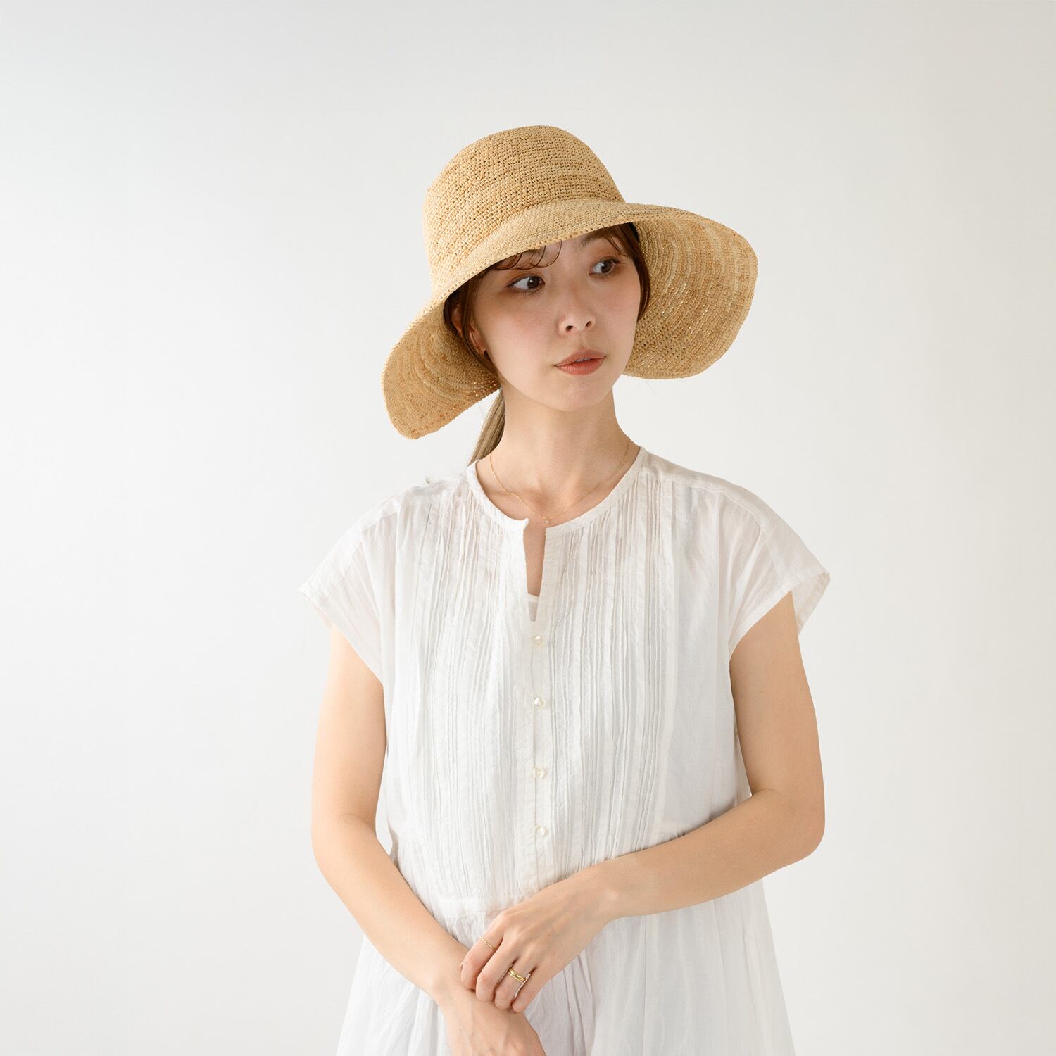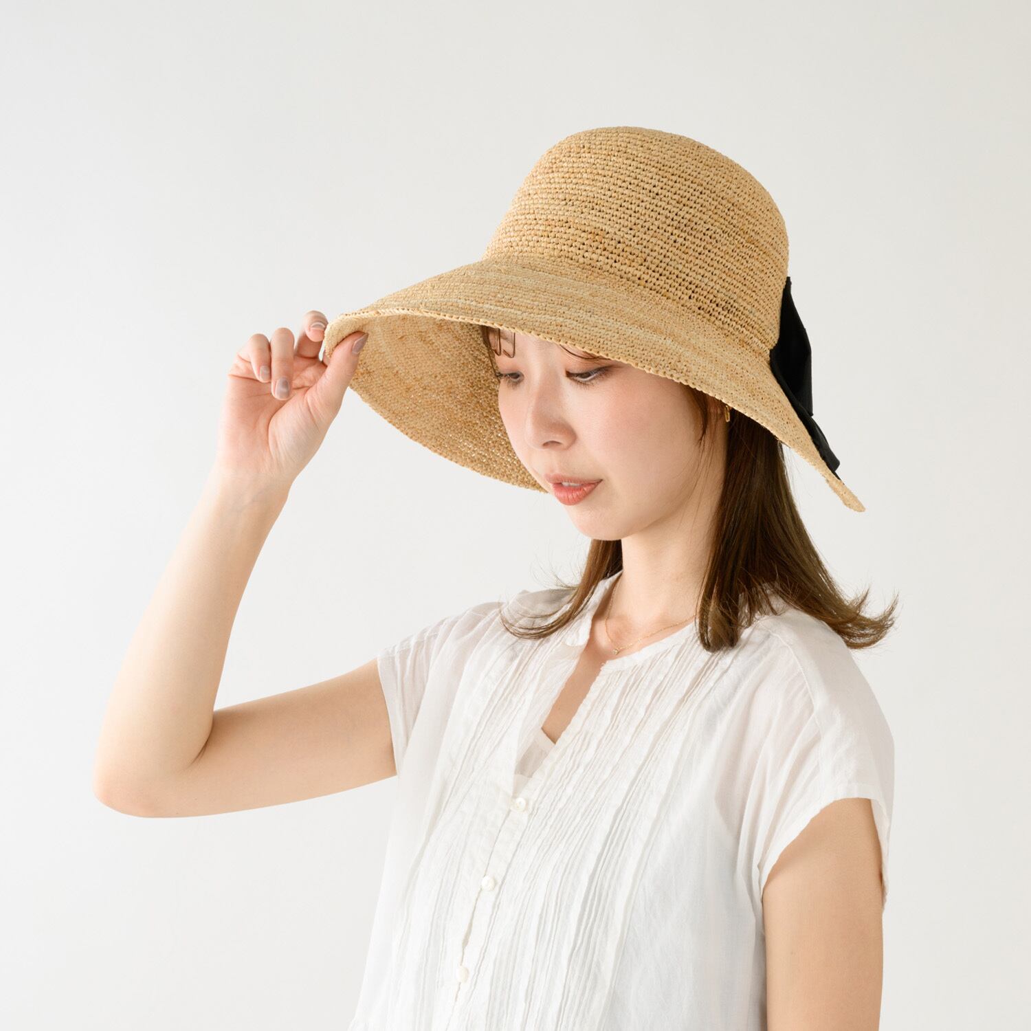 ラフィアは、天然素材で、軽量さと柔らかさが特長です。麦わらと違い、柔らかい葉を使用しているため加工がしやすく、編むことが出来ます。編んだ帽体は、折り畳んで持ち運ぶことが出来るので、旅行やちょっとした外出に最適。「軽さ」と「折り畳めること」によって、多くの女性に支持されています。