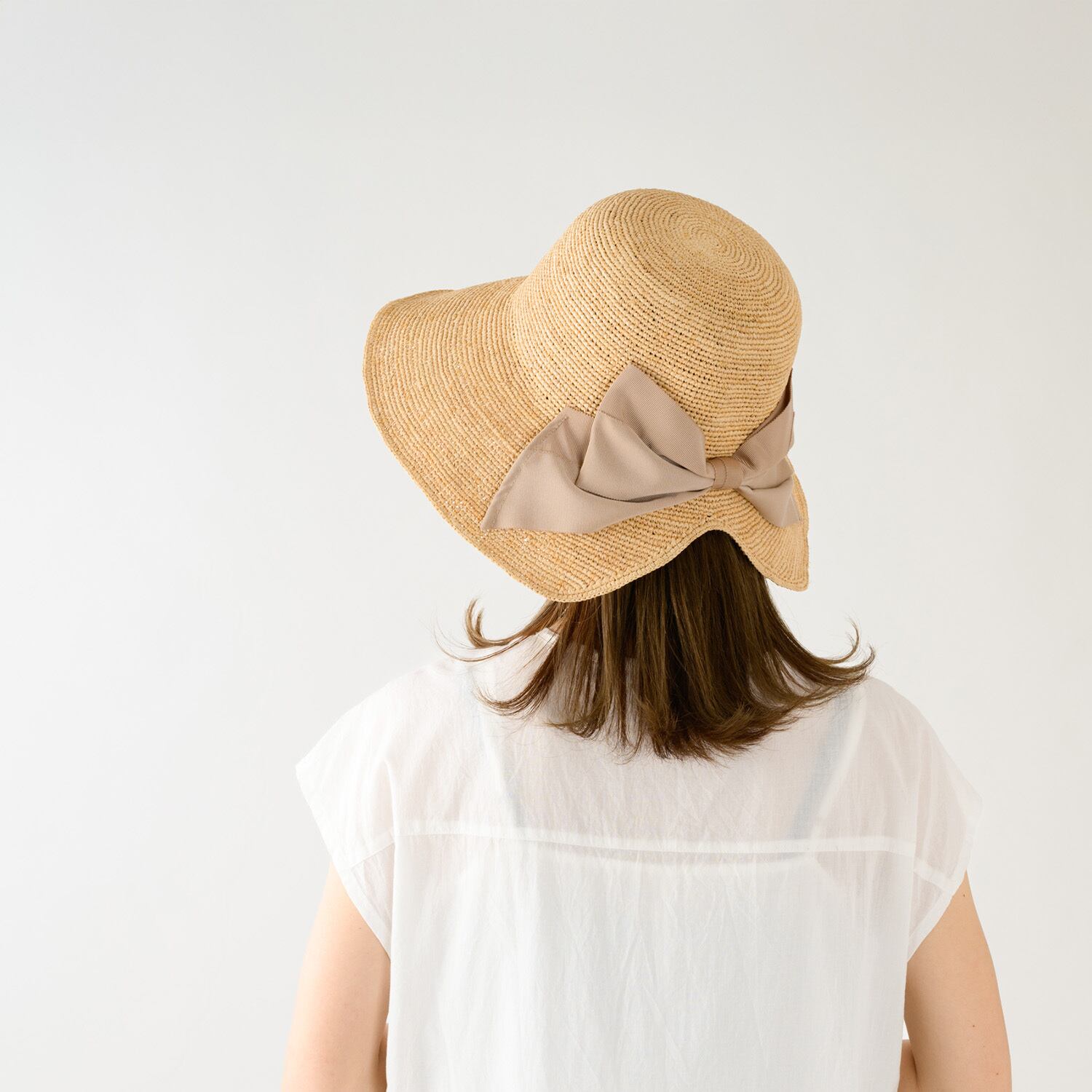 ラフィアとは、マダガスカル原産の「ラフィア椰子」の葉を加工した天然素材です。その繊維から作られる紐を編んだ素材から帽子を作っています。使うほど手に馴染み肌触りもやさしくなっていきます。