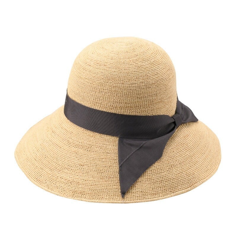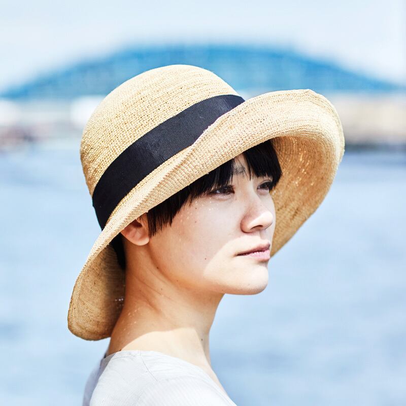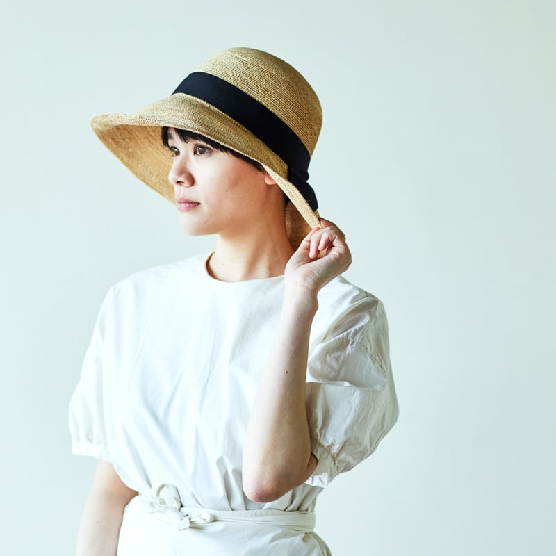 ラフィアとは、マダガスカル原産の「ラフィア椰子」の葉を加工した天然素材です。その繊維から作られる紐を編んだ素材から帽子を作っています。 使うほど手に馴染み肌触りもやさしくなっていきます。