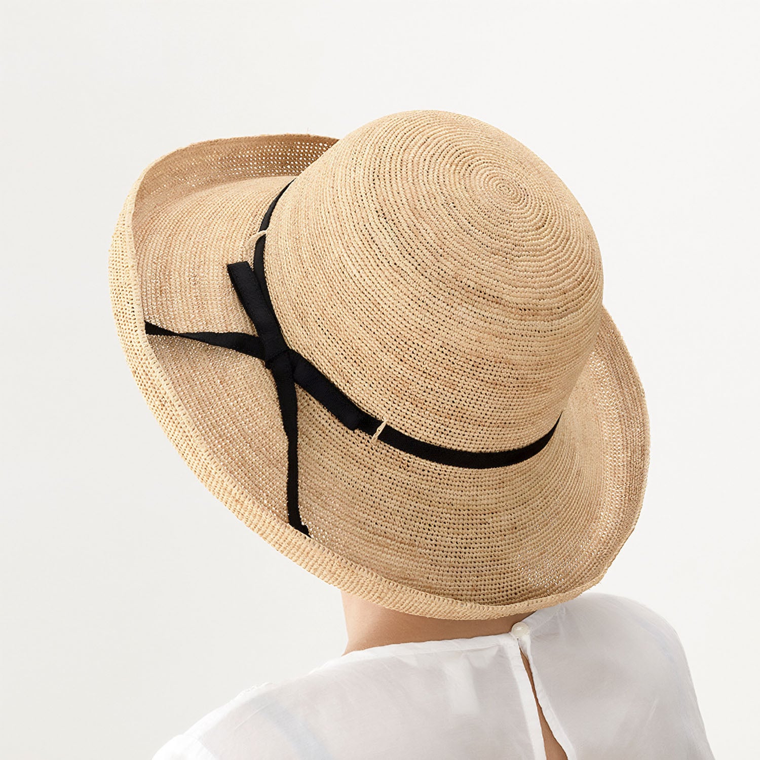 手編みのラフィア素材を使った女性用の帽子。前後のつばの長さは一緒で、つば先を少しアップさせた軽やかなデザインです。つば先に形状記憶のワイヤーが入っているので、型崩れの心配がありません。よって、日差しが強い場合は、つばを下ろして顔や首筋をより守ることができます。