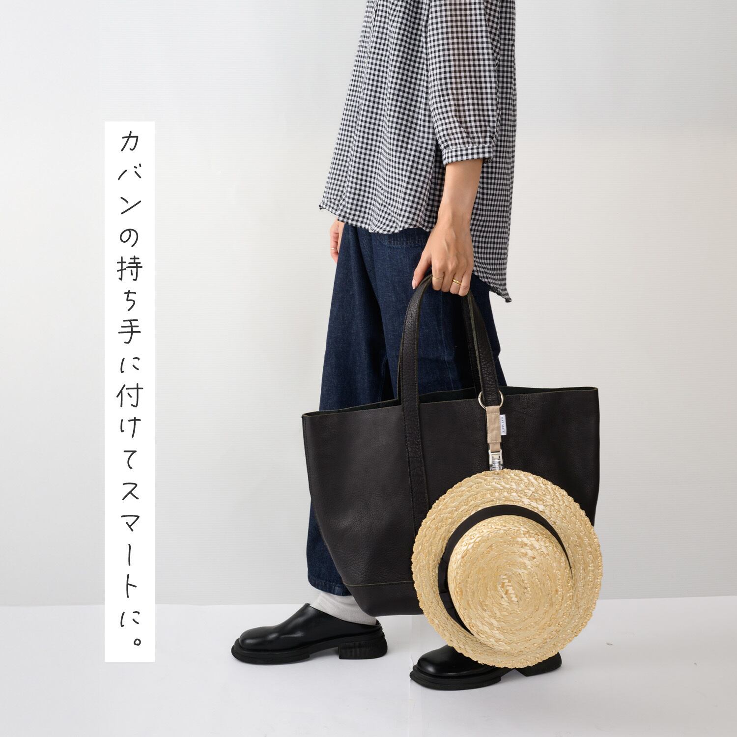 取り付けるバッグの持ち手が太い場合など、大きさが合わない時にも安心。丸カラビナは市販のものに簡単に付け替えられるため、用途や好みに合わせて調整できます。