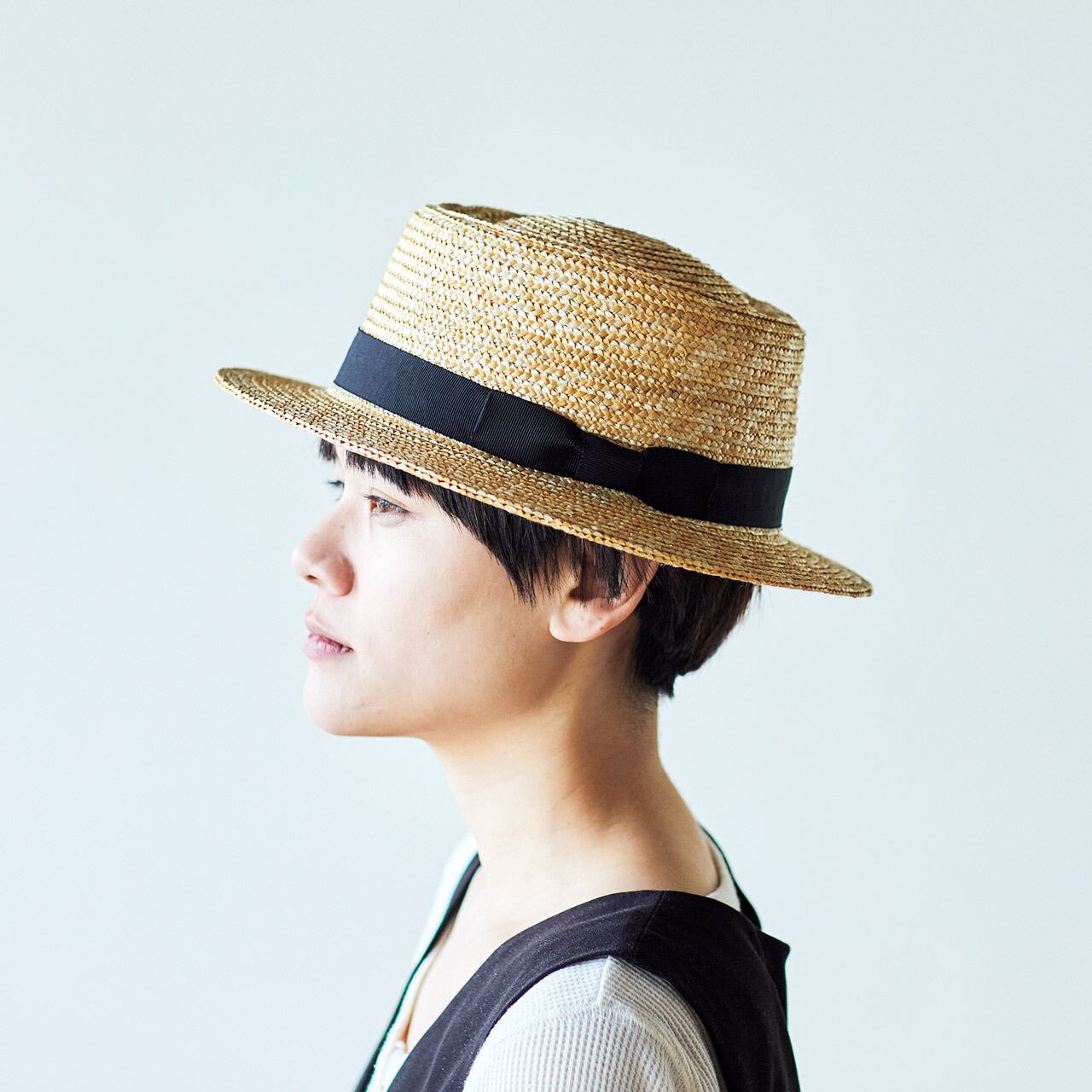本来は、わずかに上向きにカールしたつばが特長の帽子ですが、本製品はカンカン帽のようにつばを横にピンと伸ばした形にしています。