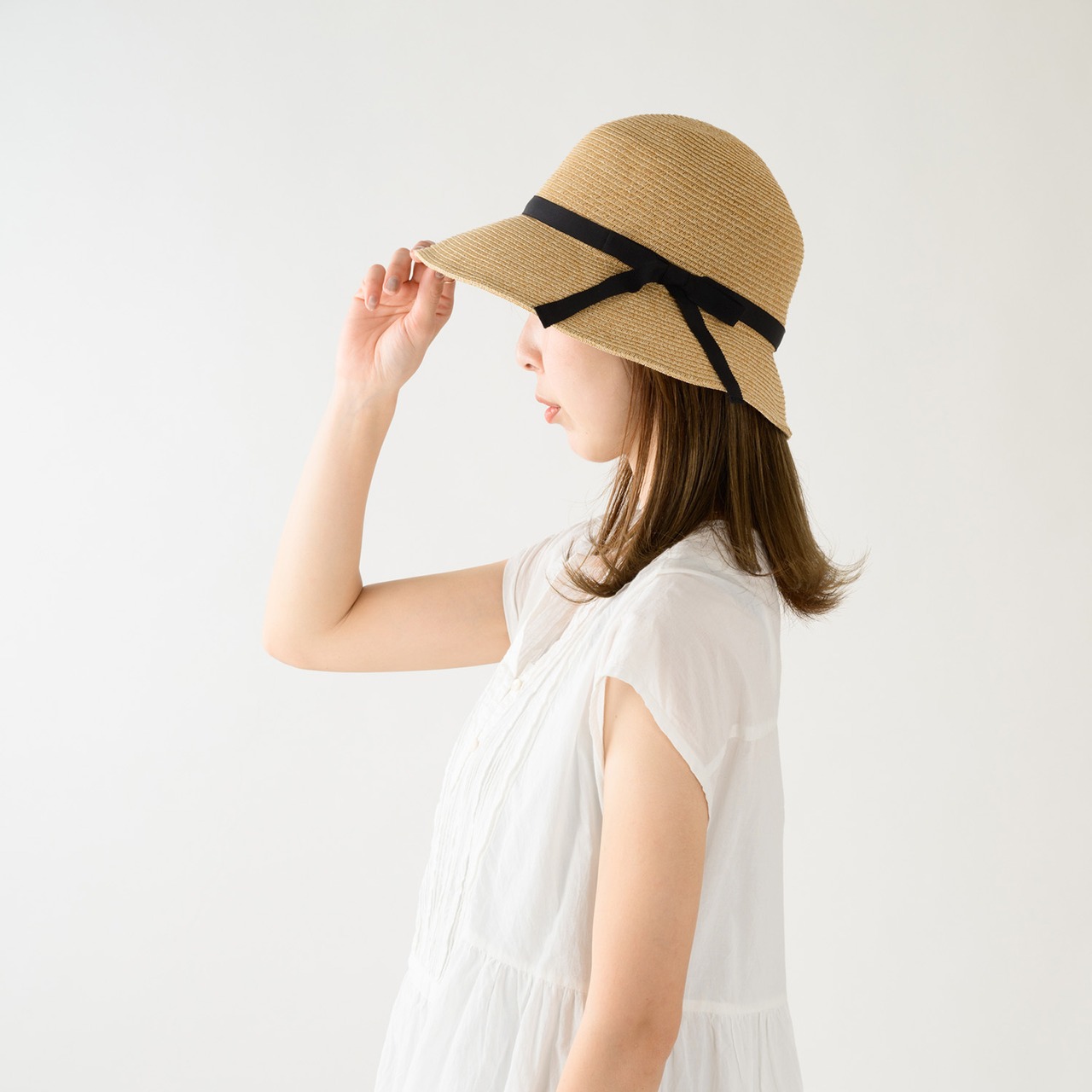 折り畳みができる麻調のペーパーブレードを使用した女性用ハット。つばには前後差があり、バランスの良いシルエットになっています。リボンはサイドに蝶結びでシンプルに留めており、可愛らしいデザイン。